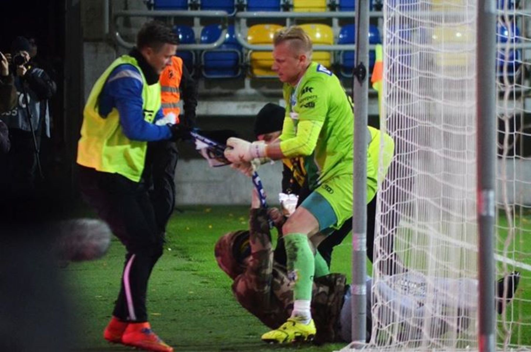 Gospodarzy natomiast, już na maksa, wybiła z rytmu sytuacja z 45 min., kiedy jeden z napędzanych zbyt dużą fantazją kibiców Arki postanowił skroić szalik-amulet Piotrka Skiby. „Bubu”, któremu taka sytuacja przydarzyła się już po raz drugi w karierze, tym razem był bardzo czujny i zareagował natychmiast, nie dopuszczając do straty swojej relikwii. Jak pokazały zdjęcia, mocno w walce z przeciwnikiem pomógł mu Paweł Łukasik, który, jak to on, zawsze lubi być w centrum wydarzeń ;)